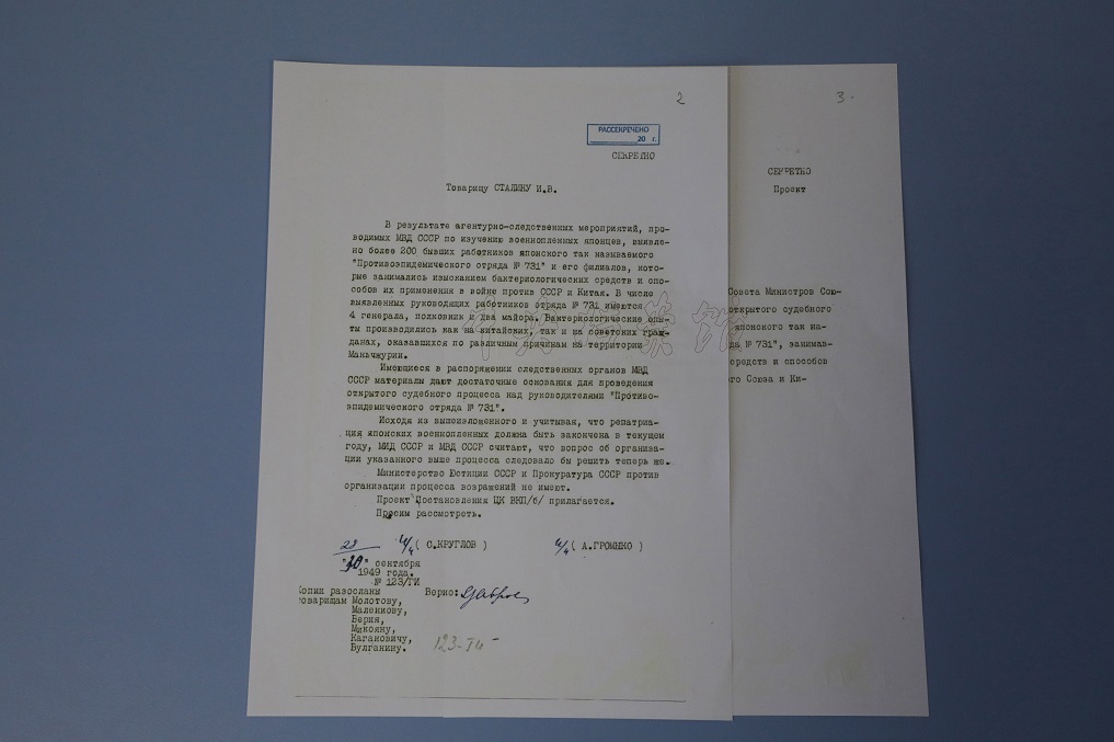 دغه اسناد د روسیې لخوا چین ته ورکړل شول چې پکې د جاپان د ۷۳۱ نمبر پوځي ډلې د پلټنې راپور، د دې ډلې له غړو څخه د پوښتنې کولو یادښت او د شوروي اتحاد حکومتي سندونه پکې شامل دي چې د ۱۹۳۹ کال د مې له ۱۱مې نېټې څخه د ۱۹۵۰ کال د دسمبر تر ۲۵مې نېټې پورې ښکېل دي.